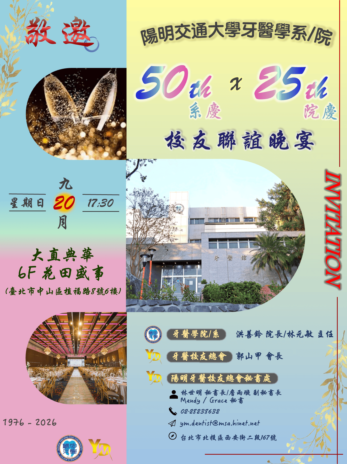 促進學術研究 聯繫校友感情 提升醫療品質 增進校友福利 .活動看板. 口腔衛生醫療服務隊 2026苗栗大出隊 【預告篇💕請先留日期】牙醫學系50週年系慶暨牙醫學院25週年院慶 📌【數位校友證申請】📌 看更多活動 .課程資訊. 2026系列課程 – 新北市牙醫師公會&陽明牙醫校友會新北市分會聯合辦理 🌟【2026 大台北國際牙展暨學術年會】🌟最頂級的組合 ✨ 🎓 PGY 訓練課程開放報名中! 看更多課程 .保險資訊. 公告「115年度全民健康保險牙醫門診總額特殊醫療服務計畫」 115年度「全民健康保險醫療服務給付項目及支付標準」【尚未公告/尚未生效】 115年適用牙醫相對合理門診點數給付原則之鄉鎮名單 看更多保險相關資訊 .徵才資訊. 【合夥、頂讓】甄美美學牙醫診所 【徵才】大衛牙醫診所 【出租】台北公館蛋黃區牙科診所出租 看更多徵才資訊