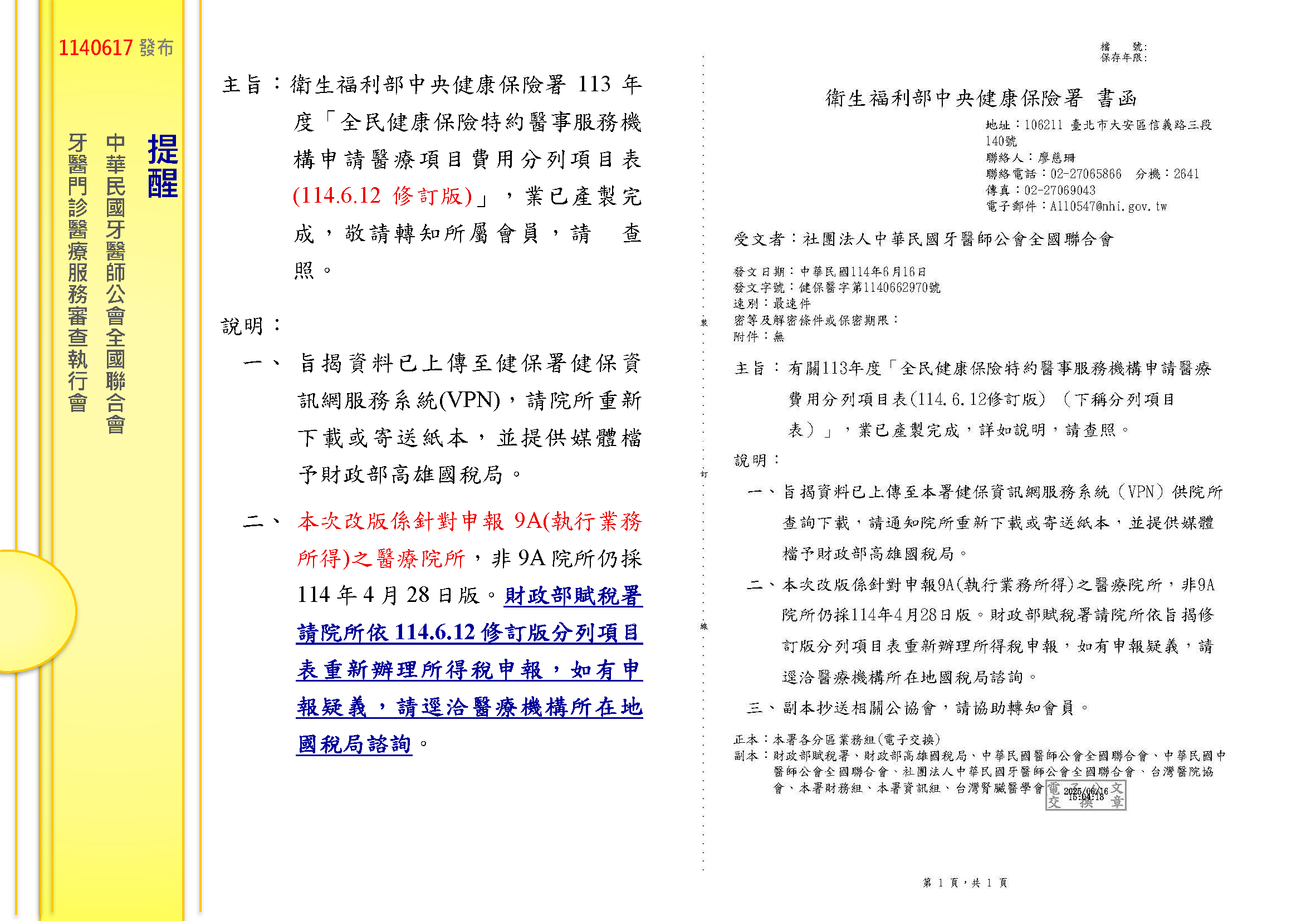 全民健康保險特約醫事服務機構申請醫療項目費用分列項目表(114.6.12修訂版)作者: ymdd / 2025-06-18 衛生福利部中央健康保險署113年度「全民健康保險特約醫事服務機構申請醫療項目費用分列項目表(114.6.12修訂版)」,業已產製完成,敬請轉知所屬會員,請 查照。 說明:一、旨揭資料已上傳至健保署健保資訊網服務系統(VPN),請院所重新下載或寄送紙本,並提供媒體檔予財政部高雄國稅局。二、本次改版係針對申報9A(執行業務所得)之醫療院所,非9A院所仍採114年4月28日版。財政部賦稅署請院所依114.6.12修訂版分列項目表重新辦理所得稅申報,如有申報疑義,請逕洽醫療機構所在地國稅局諮詢。
